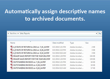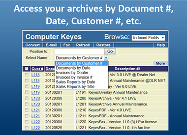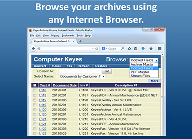 KeyesArchive contains everything needed for browsing through your archived documents so you can convert them to PDF files or TIFF images, view or print them. KeyesArchive can password encrypt the generated PDF documents, if you supply user and/or owner passwords up to 32 characters long. It also contains built in links for faxing and e-mailing.