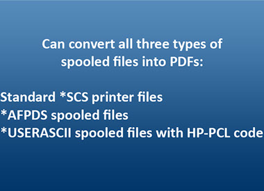 Spooled files can be standard *SCS, *AFPDS, or *USERASCII with HP-PCL code. The spooled files will be converted into TIFF images, PDF documents, or ASCII text and placed onto your IFS, or a Network drive. The resulting file can then be emailed, transferred, or copied to another destination, as desired.