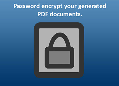 KeyesPDF can password encrypt the generated PDF documents, if you supply user and/or owner passwords up to 32 characters long.