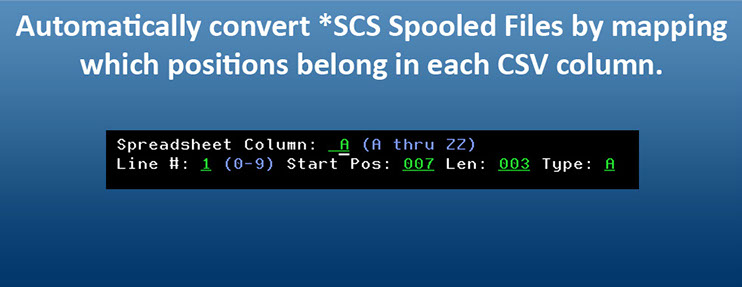 Spooled files must be standard *SCS printer files. We provide a mapping tool so that you can map each spooled file field to the desired spreadsheet columns.