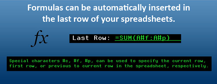Special characters #c, #f, #p, can be used to specify the current row, first row, or previous to current row in the spreadsheet, respectively.