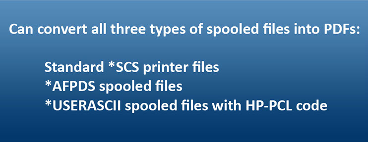 Spooled files can be standard *SCS, *AFPDS, or *USERASCII with HP-PCL code. The spooled files will be converted into TIFF images, PDF documents, or ASCII text and placed onto your IFS, or a Network drive. The resulting file can then be emailed, transferred, or copied to another destination, as desired.