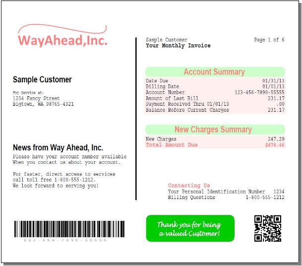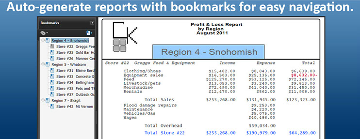 Individual documents, such as Invoices or Purchase Orders, can be prepared with overlays, and can include things like Barcodes or MICR fonts. Or, it can be used to make large reports easier to read, complete with PDF bookmarks.