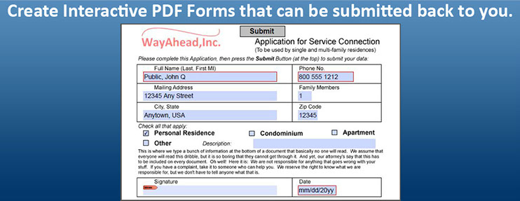 You can add Interactive Text or Checkbox fields to a PDF. A PDF with Interactive fields can be filled out by a customer and sent back to you. You can prefill some of the Interactive fields from information that you already know about a customer. The customer makes any needed changes and e-mails or uploads the Form back to you for processing.